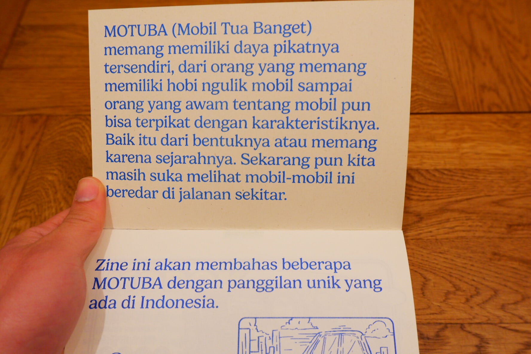 "MOTUBA"はMobil Tua Bangetの略で、インドネシアではクラシックカーのこと。コミックライクなイラストレーションと共に、インドネシアで親しまれている旧車の数々が紹介されています。メロドラマに登場した車、ユニークなデザインの車、「ナマズ」や「カエル」といった動物の愛称で親しまれている車など、人気の理由が車のスペックではないという点にも注目。